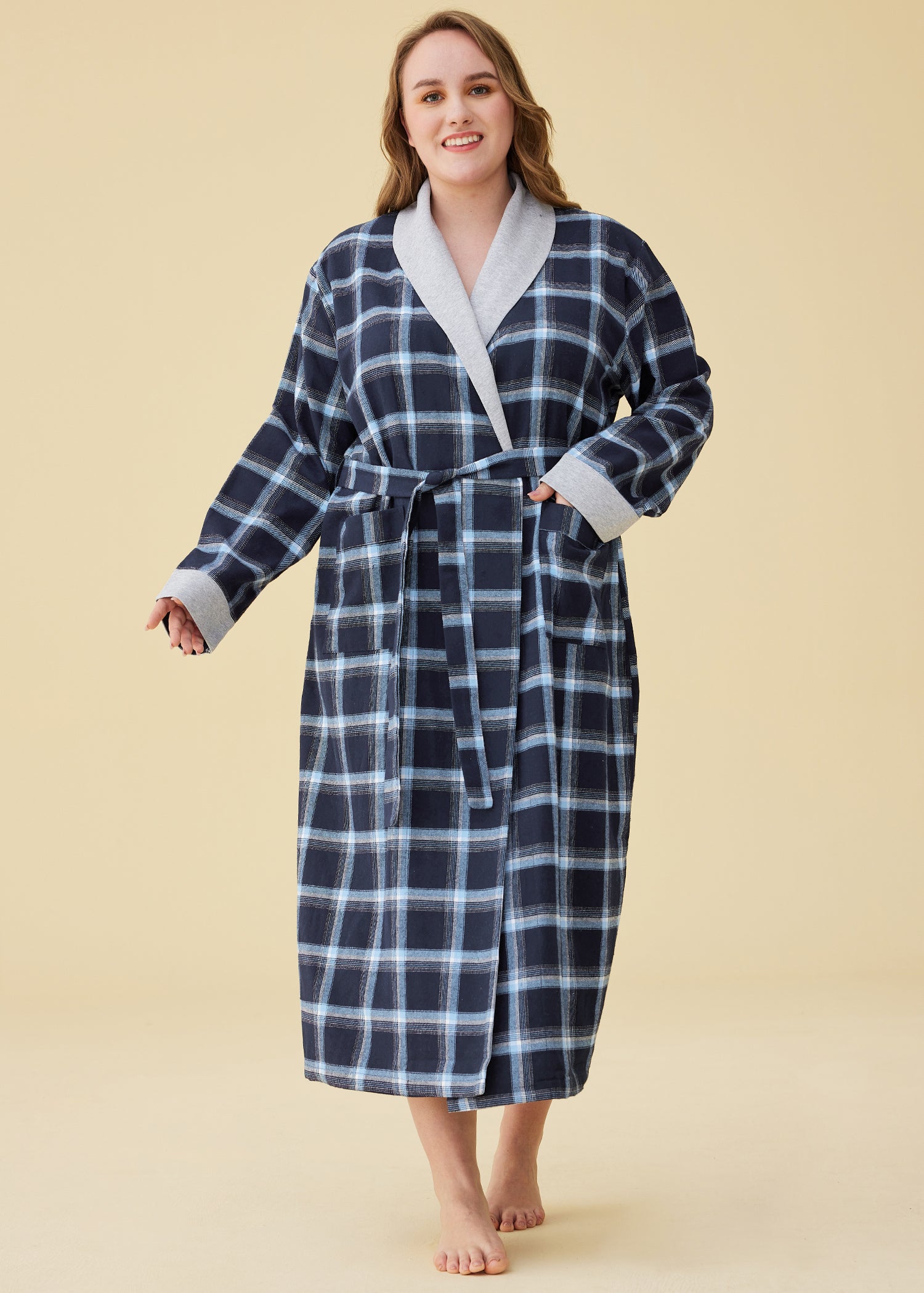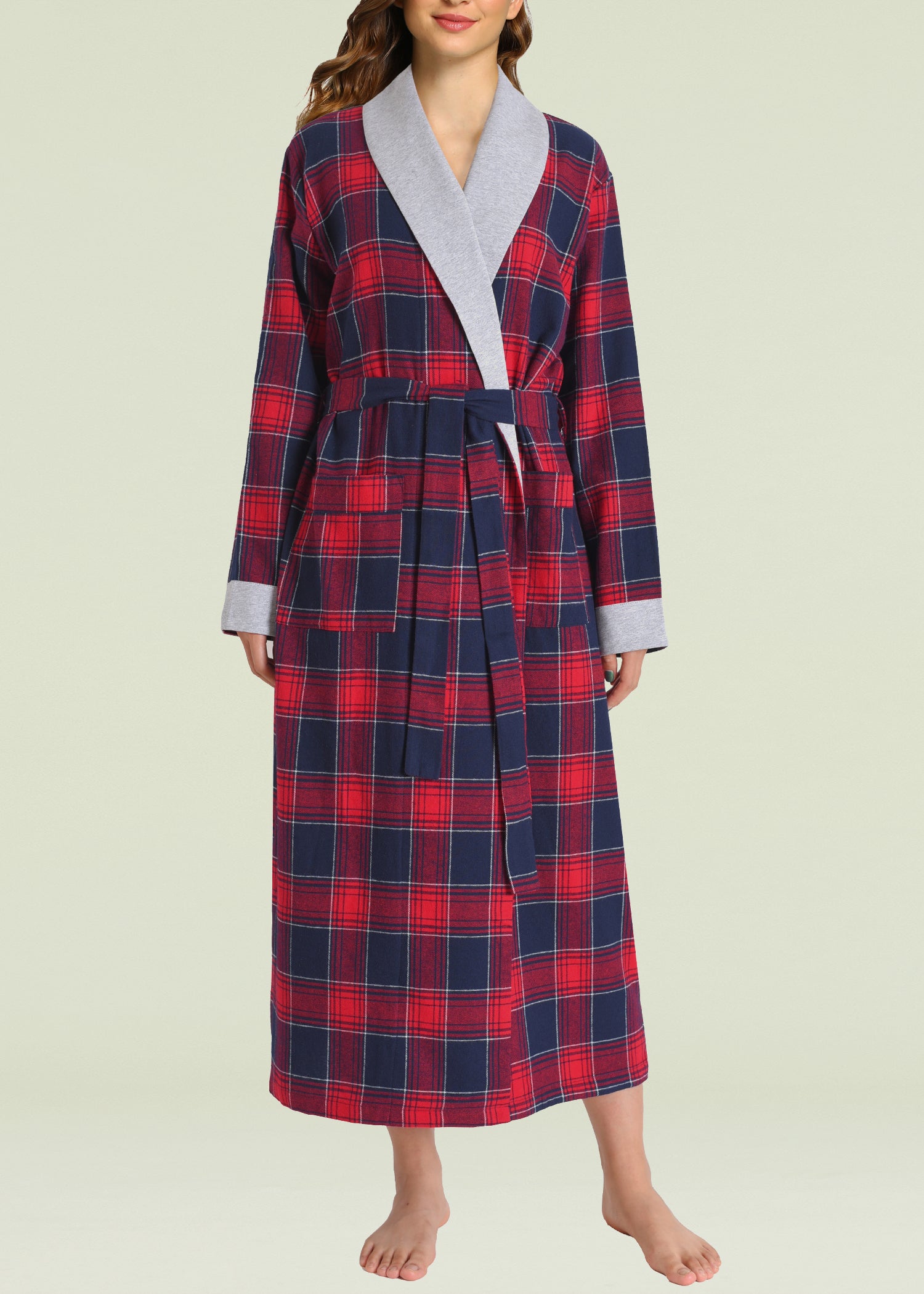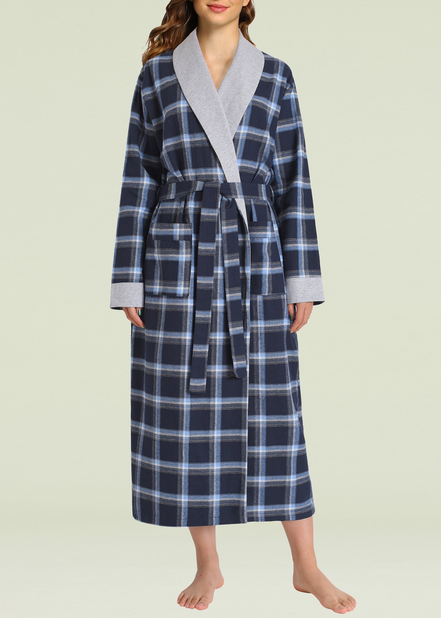 • 100% Cotton. Classic plaid robe is designed with contrasted shawl collar and cuffs, looks stylish and elegant