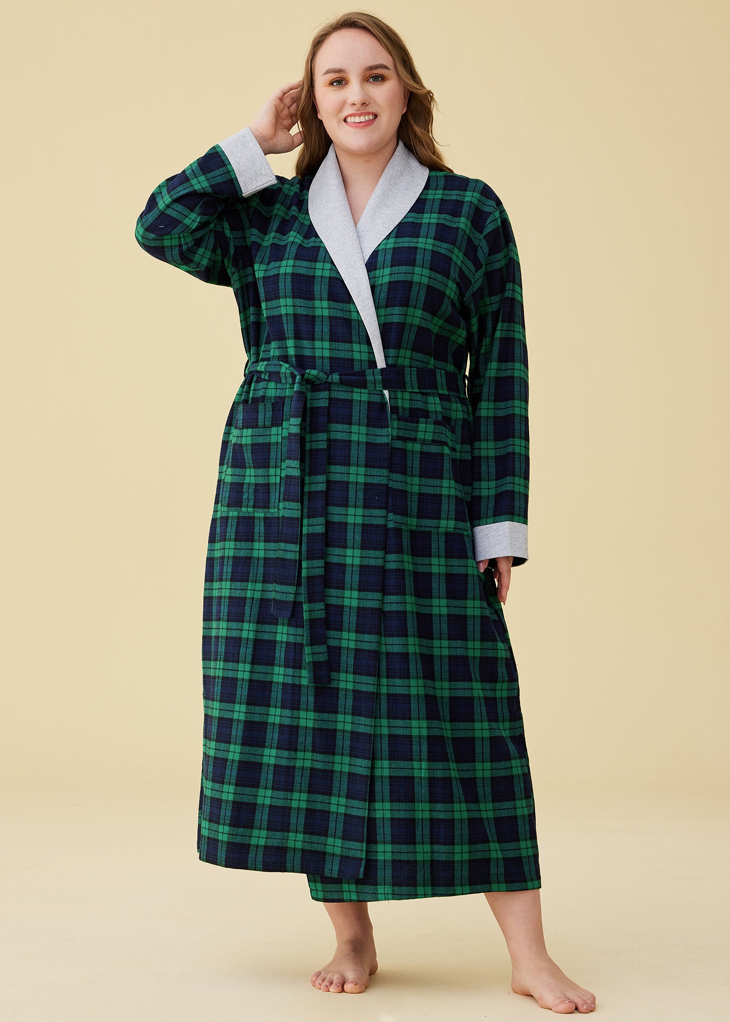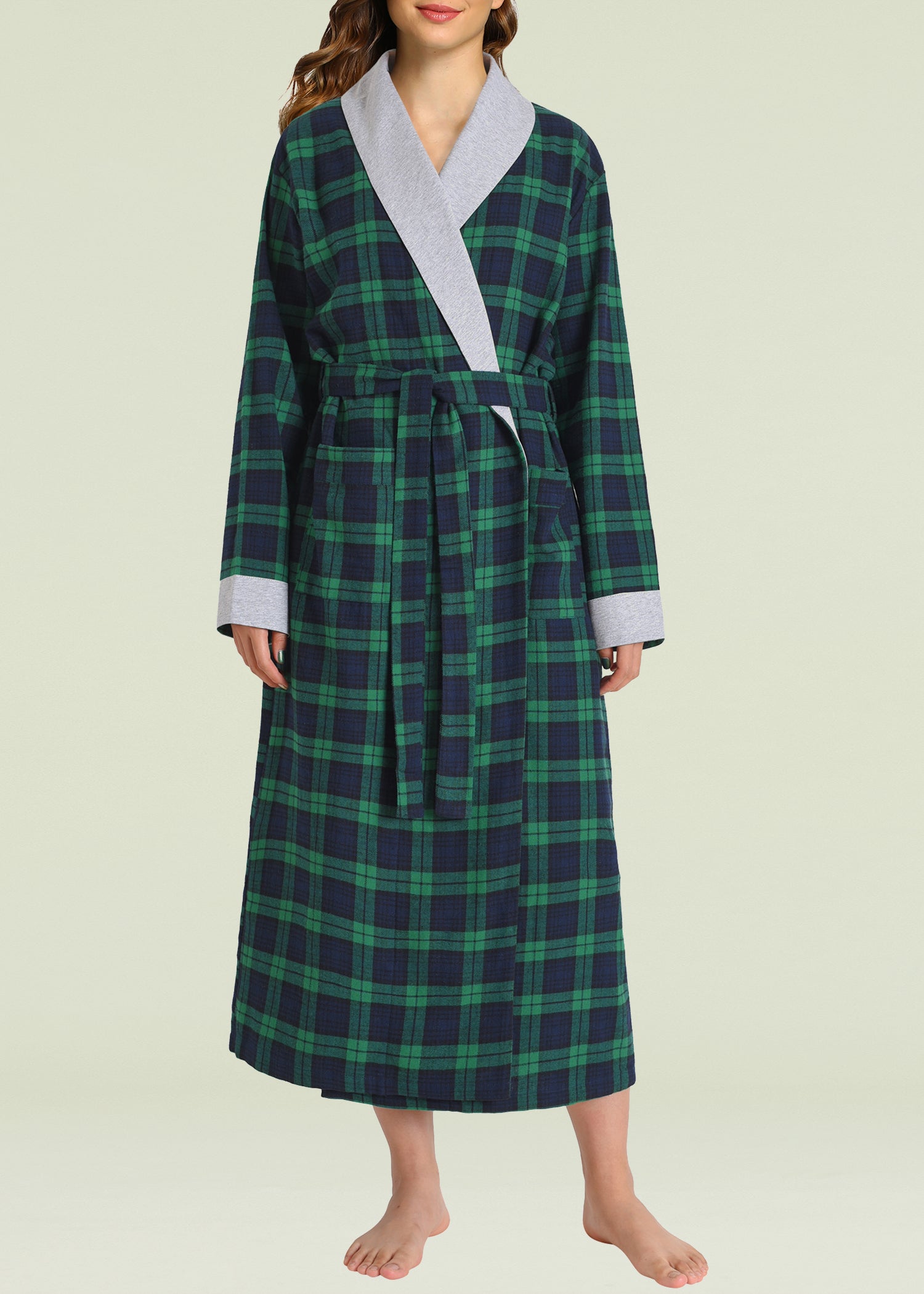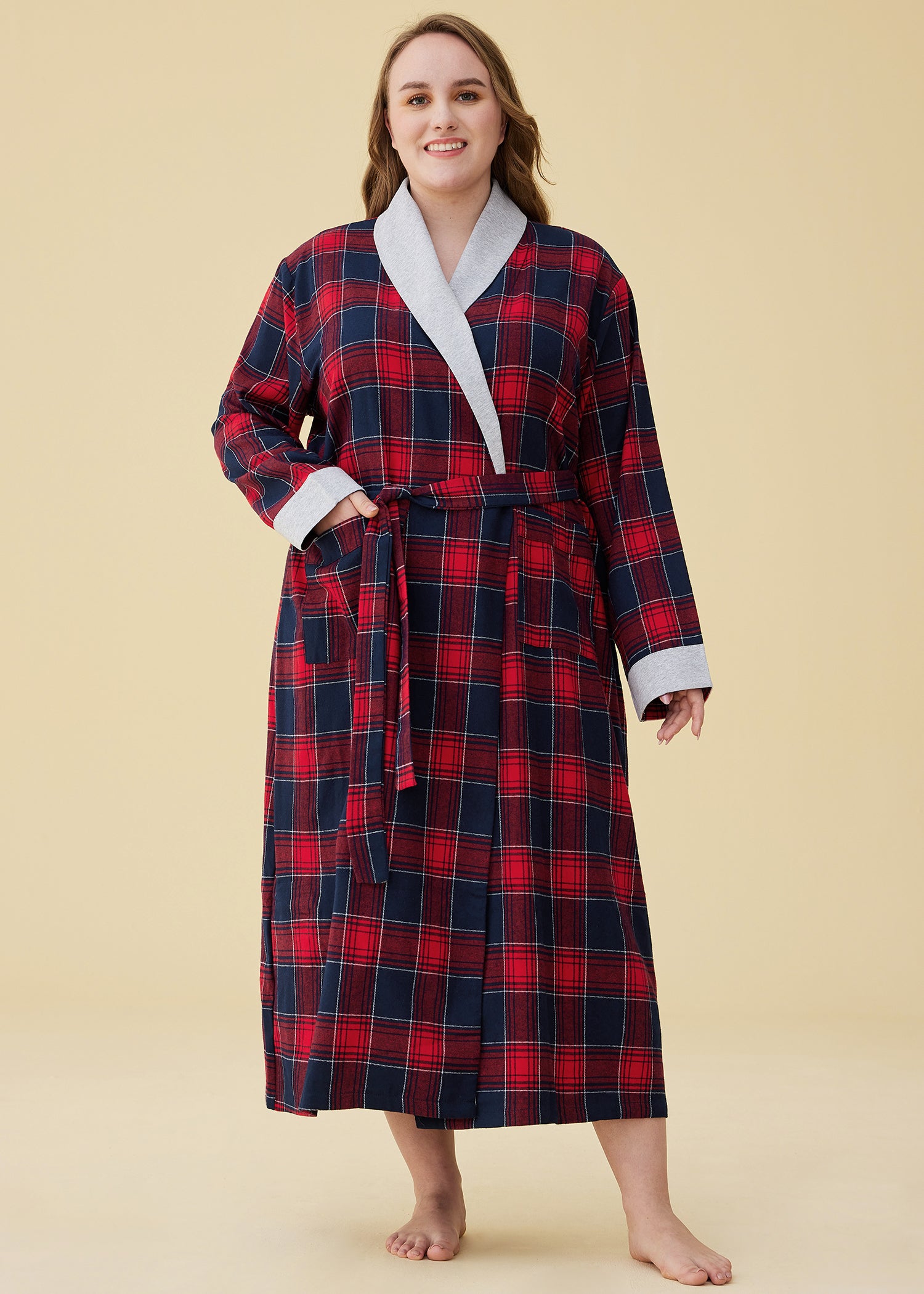 • 100% Cotton. Classic plaid robe is designed with contrasted shawl collar and cuffs, looks stylish and elegant